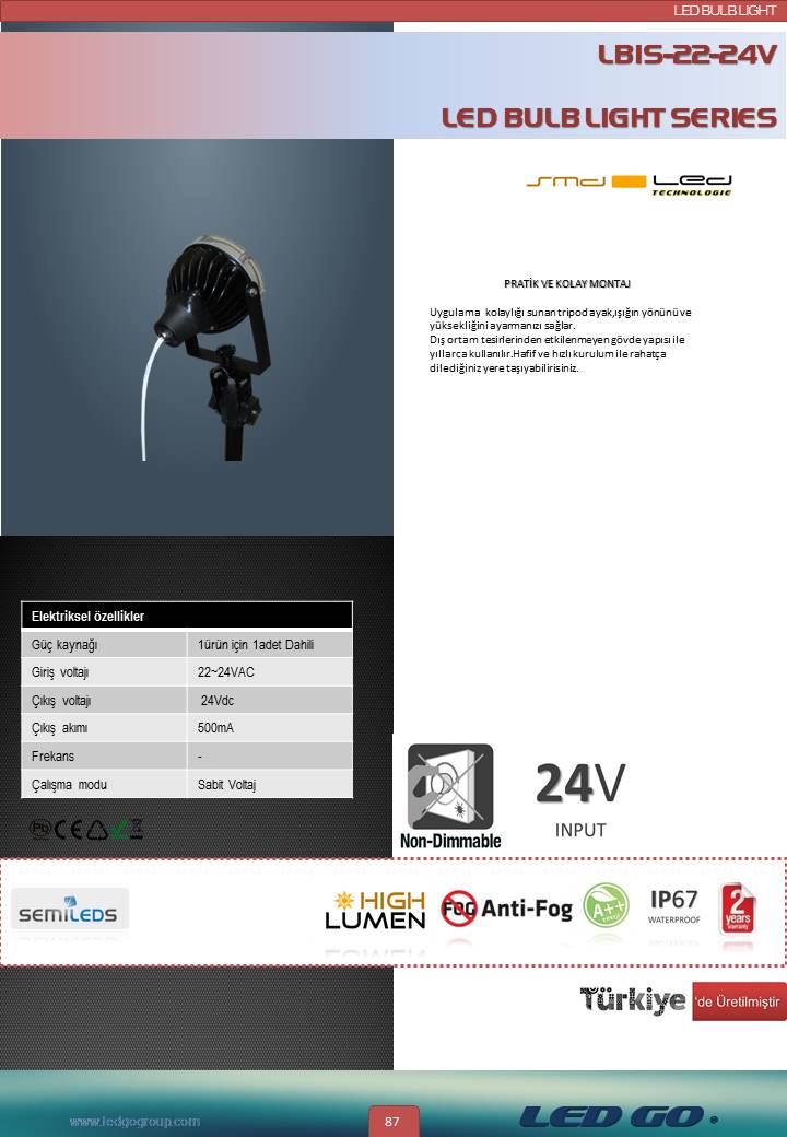 Led projektörümüz sanayii kesimleri için ihtiyaç duyulan güvenli çalışma şartlarına uygun olarak 24V AC-DC güç kaynağına bağlanabilmektedir.Böylece ortaya çıkabilecek elektrik çarpması ve kıvılcım oluşturma gibi riskler ortadan kaldırılmıştır. Küçük ve kompakt boyutları ile ön plana çıkmaktadır